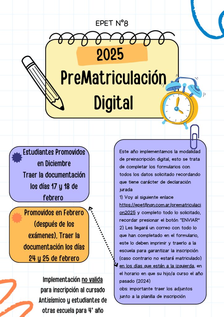 Novedades Novedades ➡️ Ver Aquí ⬅️ CuadernilloIngresantes 2026 de 1er año. Descargar Cuardernillo ➡️ Formulario de Inscripcion ⬅️ 📒 Mesas de examen taller 2026 📌 ➡️ CLIC AQUI ⬅️ Mesas de examen regulares febrero 2026 ➡️ CLIC AQUI ⬅️ Mesas de examen previas febrero 2026 ➡️ CLIC AQUI ⬅️ Accede a la Biblioteca Enlace de Inscripción IMPORTANTE - FAMILIAS Familias: A partir de este año, para reunirse con dirección, vicedirección, Regencia y asesoría pedagógica, deben de solicitar turno en secretaria. Atte. Equipo Directivo CuadernilloIngresantes 2026 de 1er año. Descargar Cuardernillo Repaso de MATEMÁTICA Descargar Cuardernillos EGRESADOS – EPET N°8Si estás sin trabajo completa el formulario para que tus datos se encuentren en una bolsa de trabajo.Saludos Equipo Directivo Ingresar al Formulario de Inscripción Pre-Matriculación Ir a la Pre-Matriculación