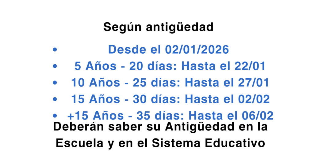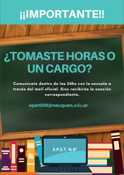 Secretaria Información de Secretaría Formulario de Solicitud de Licencias Docentes 2026 Completar el formulario Constancias de Solicitud de Licencias 2026 Subir Constancia Pedido de Articulo 80 solo Auxiliares de Servicio Completar el Formulario Completar el Formulario de VACACIONES Acceder a Vacaciones Docentes Información Docente Todos los Trabajadores de la Institución deberán leer y conocer los Procedimientos Administrativos de la Secretaria. Descargar Procedimientos 2025 Datos Personales Docentes Completar tus Datos epet008@neuquen.edu.ar Alta CON Número de Empleado: El/la docente ingresante CON NÚMERO DE EMPLEADO debe armar su legajo presentando la siguiente documentación VÍA MAIL . * Acta de Designación (Asamblea). * DNI (En formato PDF). * Título (En formato PDF). * Declaración Jurada de cargos (Presentar en Secretaria Docente). * Declaración Jurada de Datos Personales (adjuntado en el link). * Domicilio In Itinere (adjuntado en el link). * Cuaderno de Actuaciones (Presentarlo en la Institución al presentarse en la institución) Descargar Formularios Alta SIN Número de Empleado: El/la docente ingresante SIN NÚMERO DE EMPLEADO debe armar su legajo presentando la siguiente documentación. * DNI (En formato PDF). * Título (En formato PDF). * Declaración Jurada de cargos (Presentar en Secretaria Docente). * Declaración Jurada de Datos Personales (adjuntado en el link). * Domicilio In Itinere (adjuntado en el link). * Circular N°19 (adjuntado en el link). * Certificado de Buena Salud (Formato PDF). * Certificado de Antecedentes Policiales (Provincial y Nacional) * Constancia de CUIL (Formato PDF). * Constancia de últimos Votos o Constancia de no Infractor . * Cuaderno de Actuaciones (Presentarlo en la institución). Descargar Formularios Recepción de Constancias de Licencias por Estudio Docente Cargar las Constancias Descarga de Formularios de Utilidad DOCENTES: Formulario de Renuncia Solicitud de Licencia PL2 Declaración Jurada de Datos Personales Actualización de Domicilio (In Itineri) Declaración Jurada de Cargos Declaración Jurada de 1661 Formularios de Utilidad Requisitos para cargas y asignaciones Familiares: Leer Información sobre las Asignaciones Enlaces de Utilidad... Constancia de CUIL Certificación Negativa ANSES